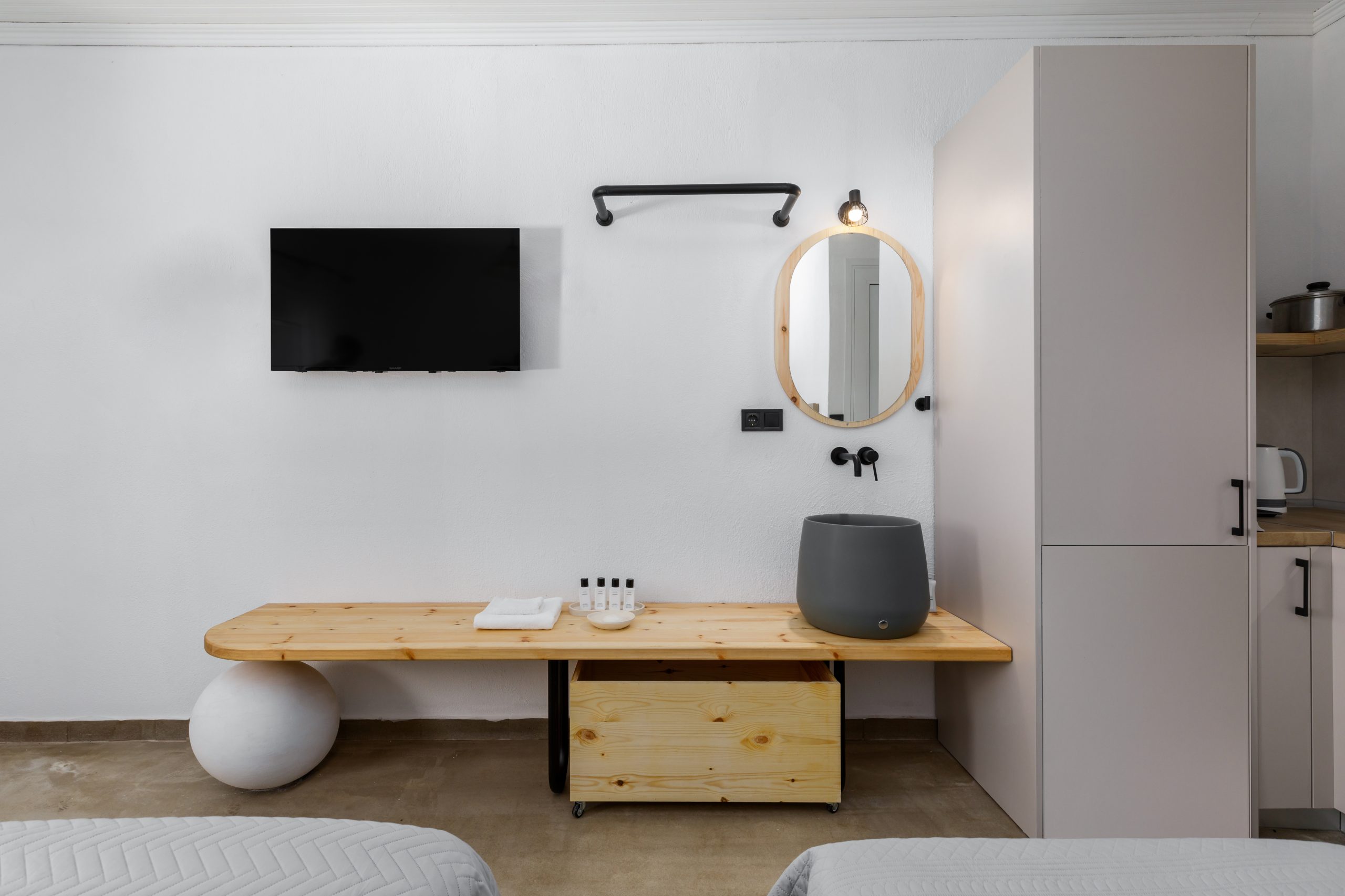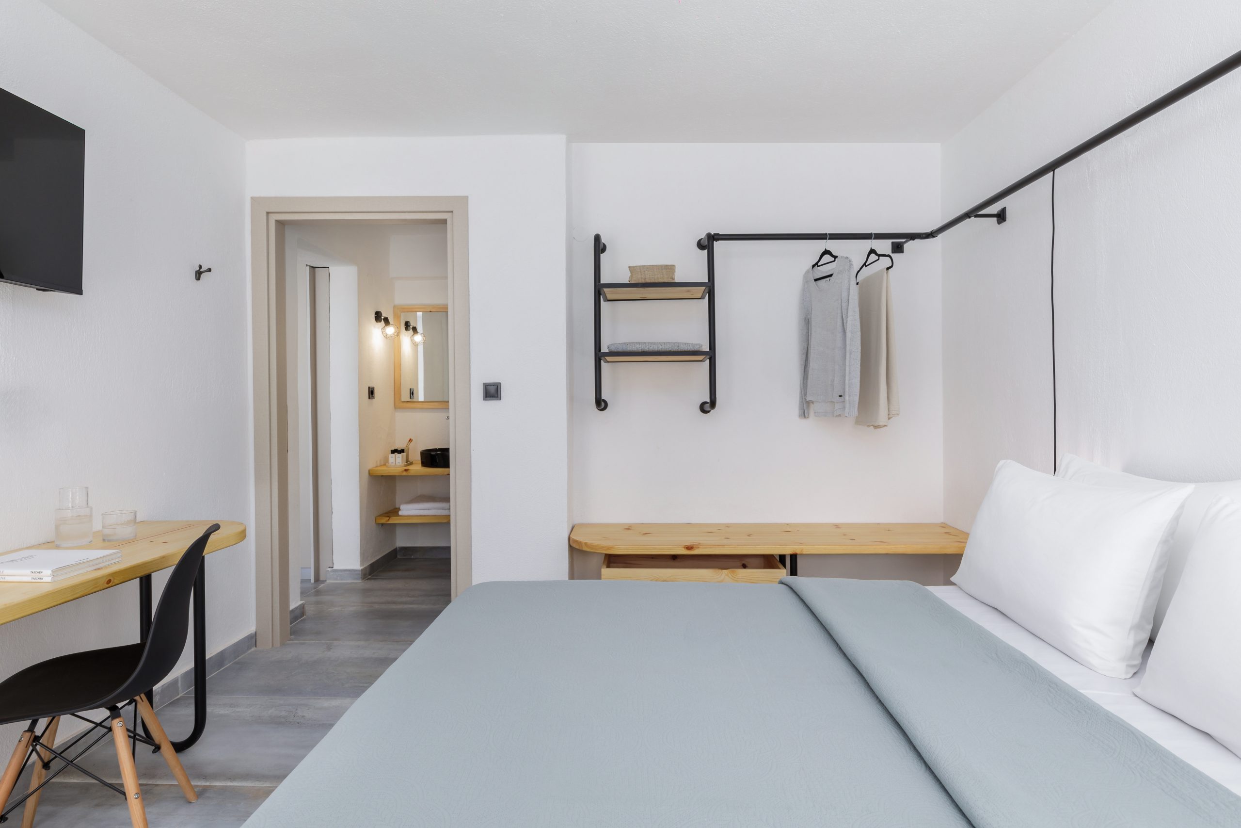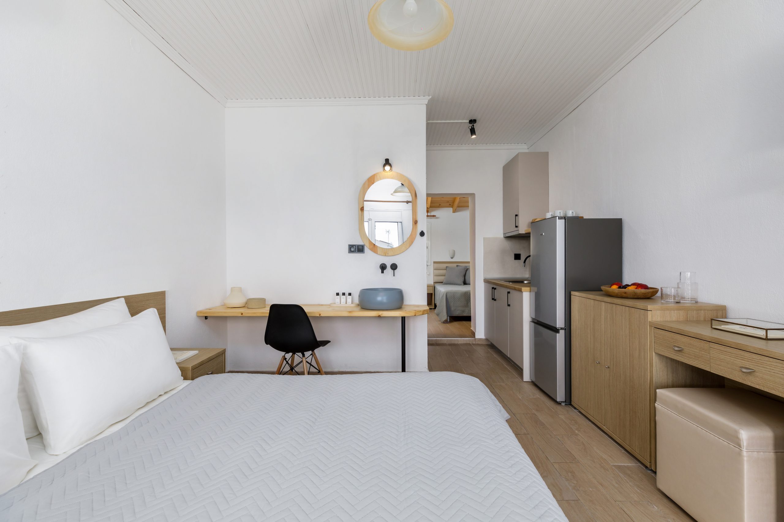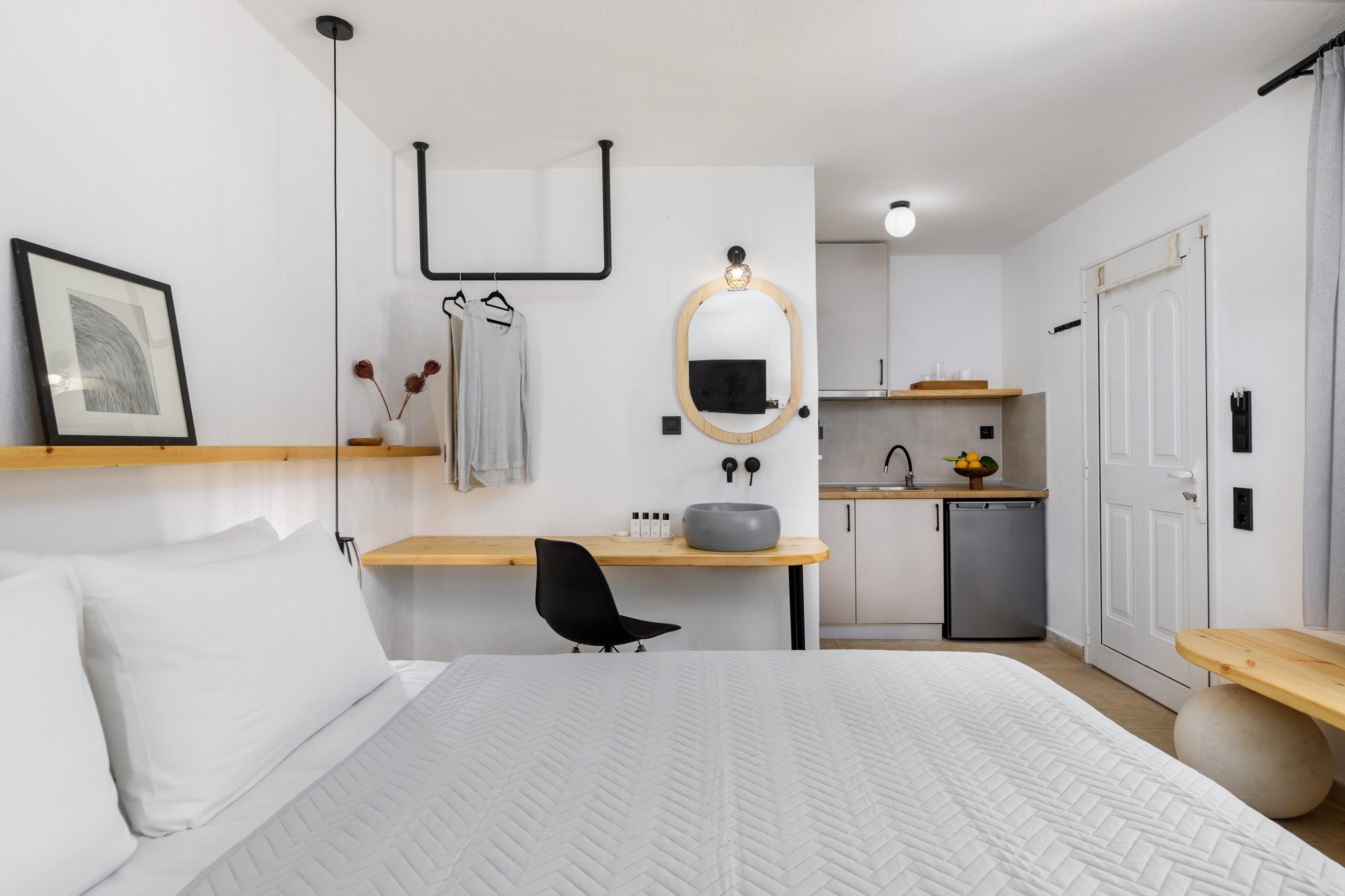 The rooms are newly renovated and feature a modern, minimalist design that combines traditional Greek island architecture with the simplicity and elegance of contemporary interiors. Each room is air-conditioned and equipped with a TV, bathroom, kitchenette with the basic equipment and comfortable balconies with dining tables.
