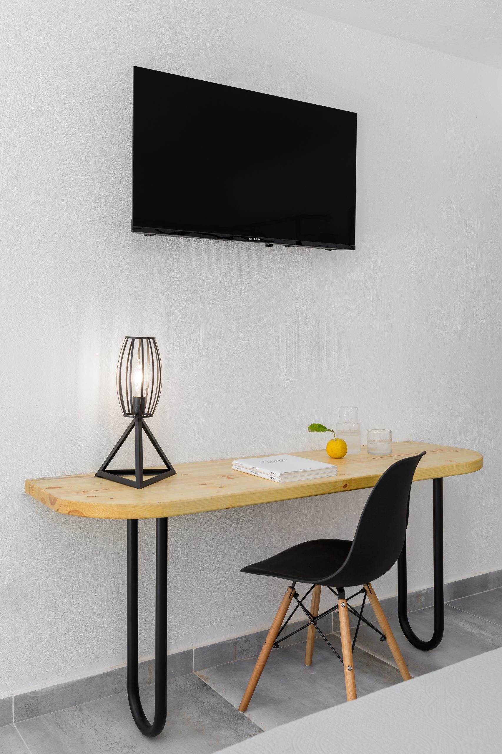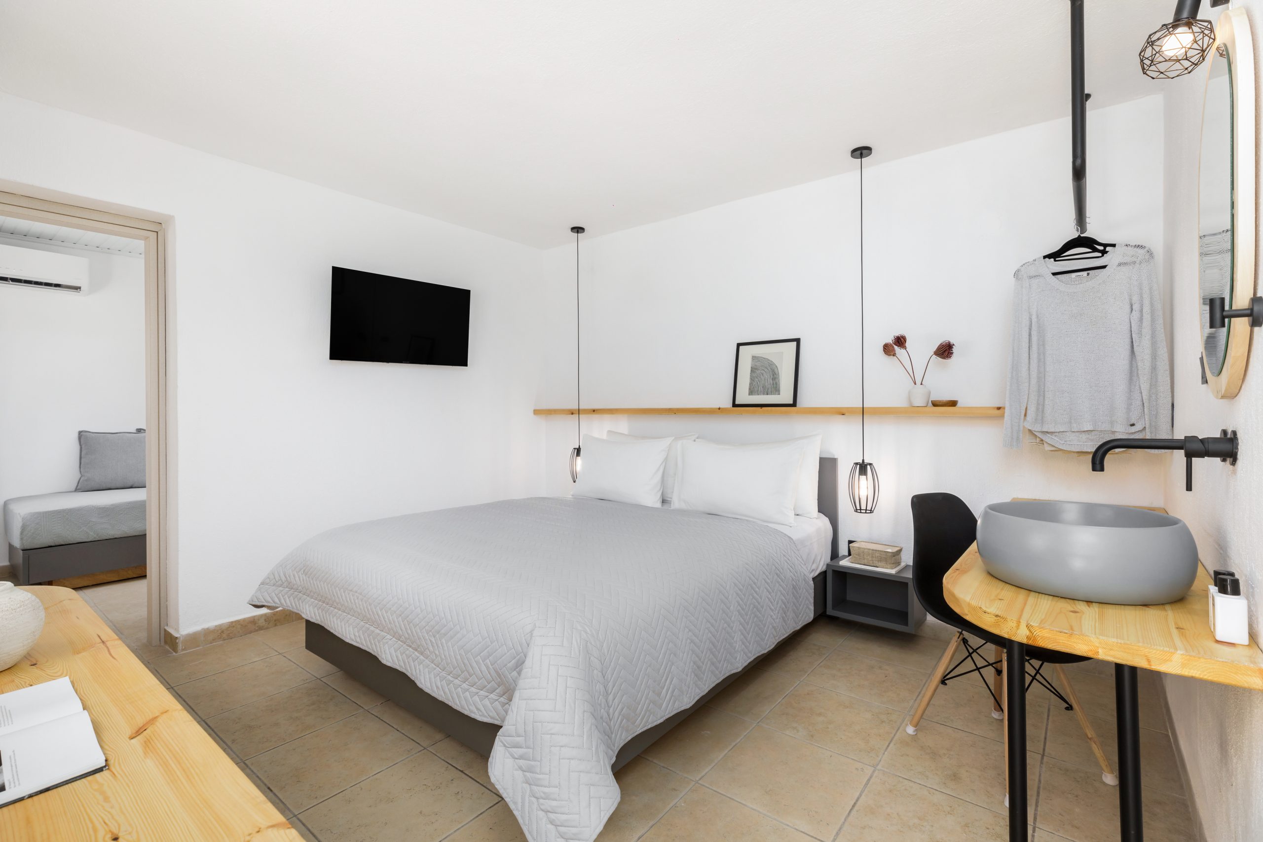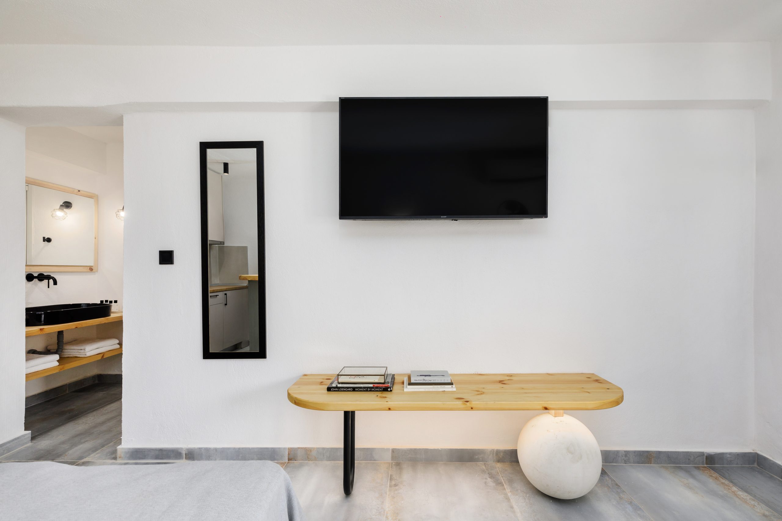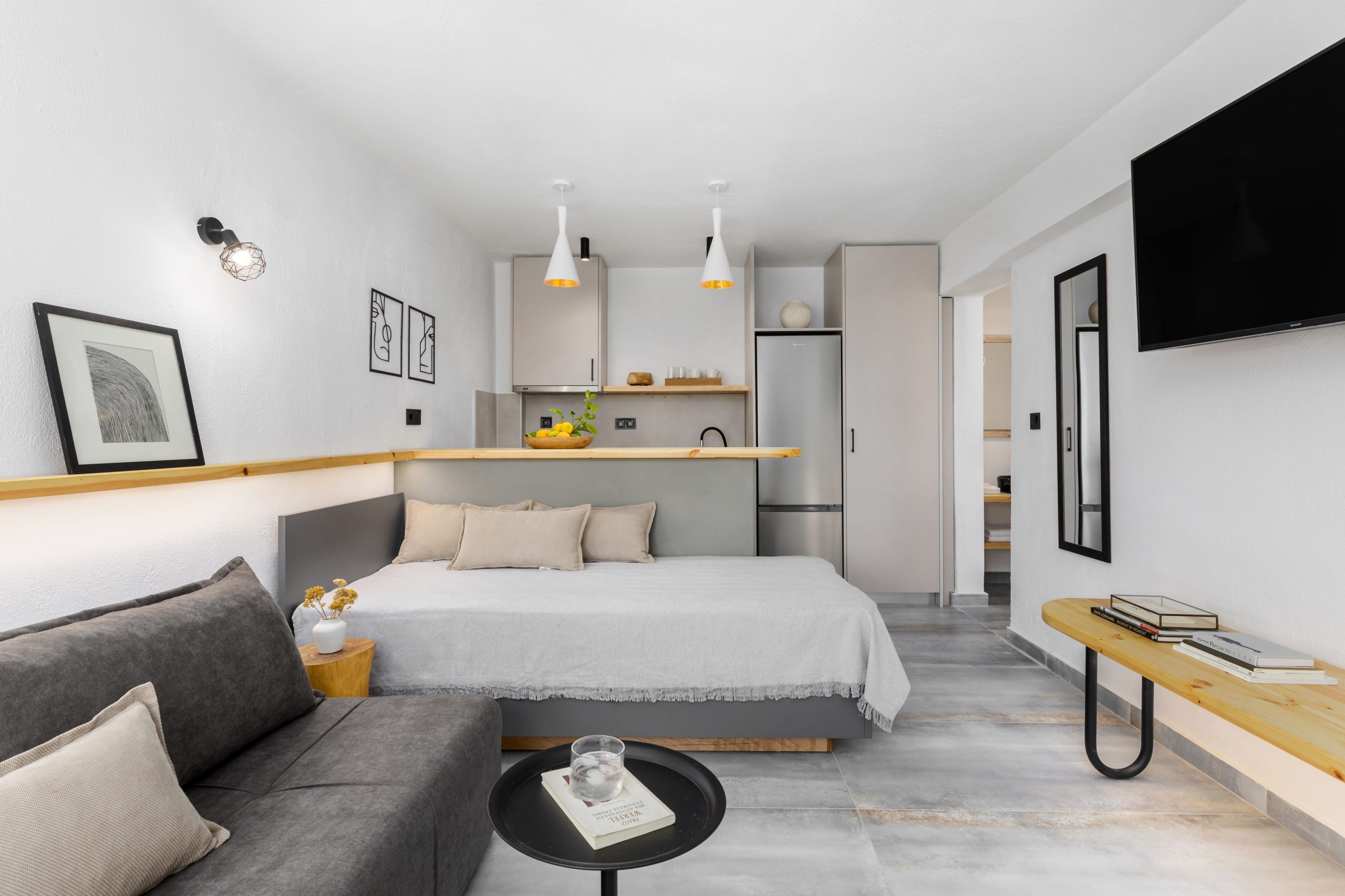 The rooms are newly renovated and feature a modern, minimalist design that combines traditional Greek island architecture with the simplicity and elegance of contemporary interiors. Each room is air-conditioned and equipped with a TV, bathroom, kitchenette with the basic equipment and comfortable balconies with dining tables.