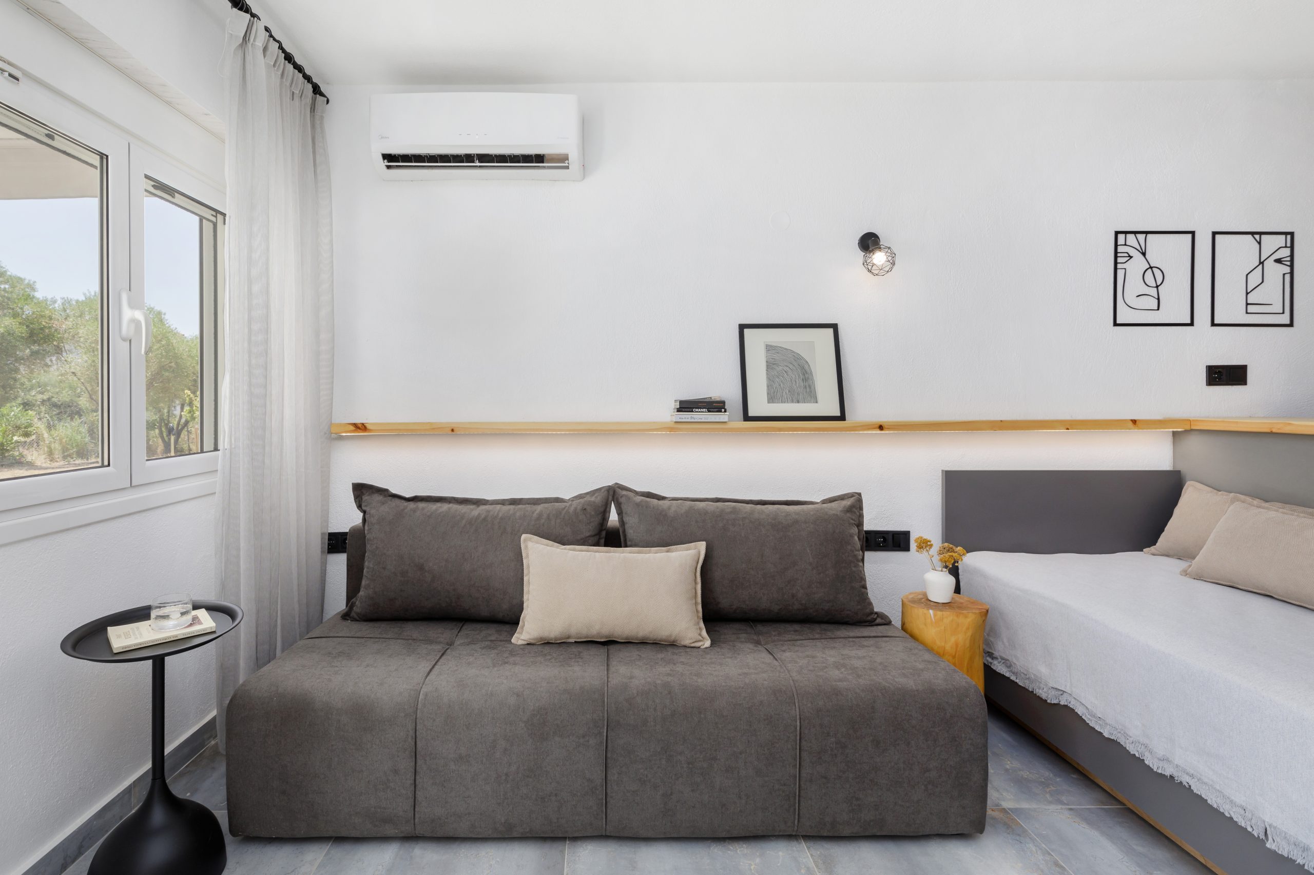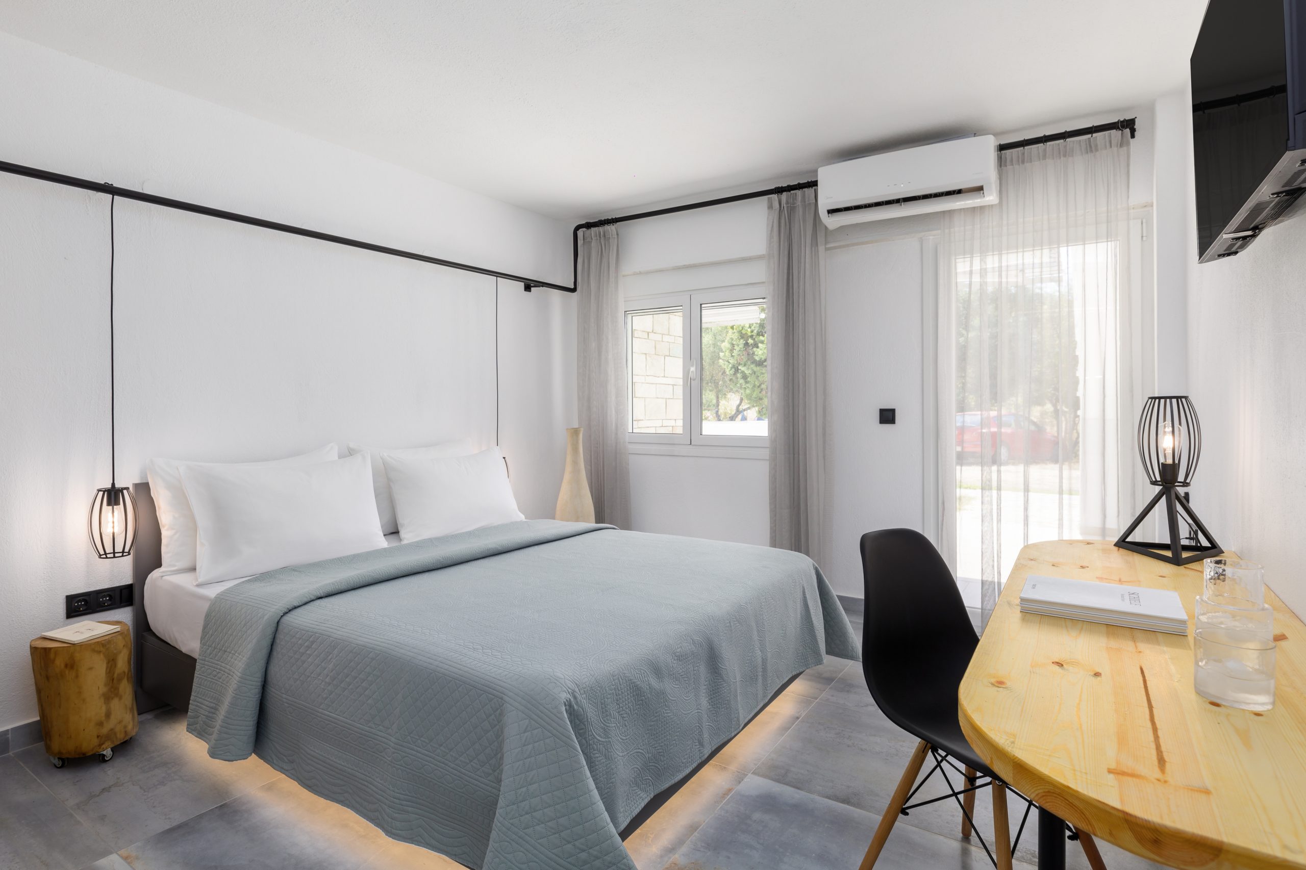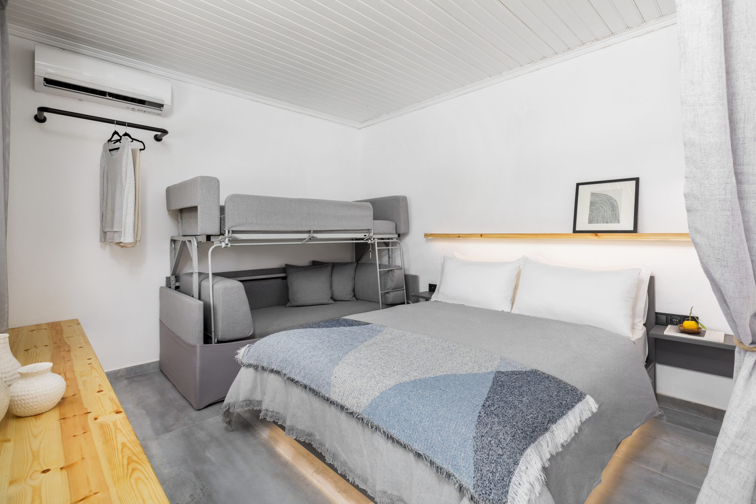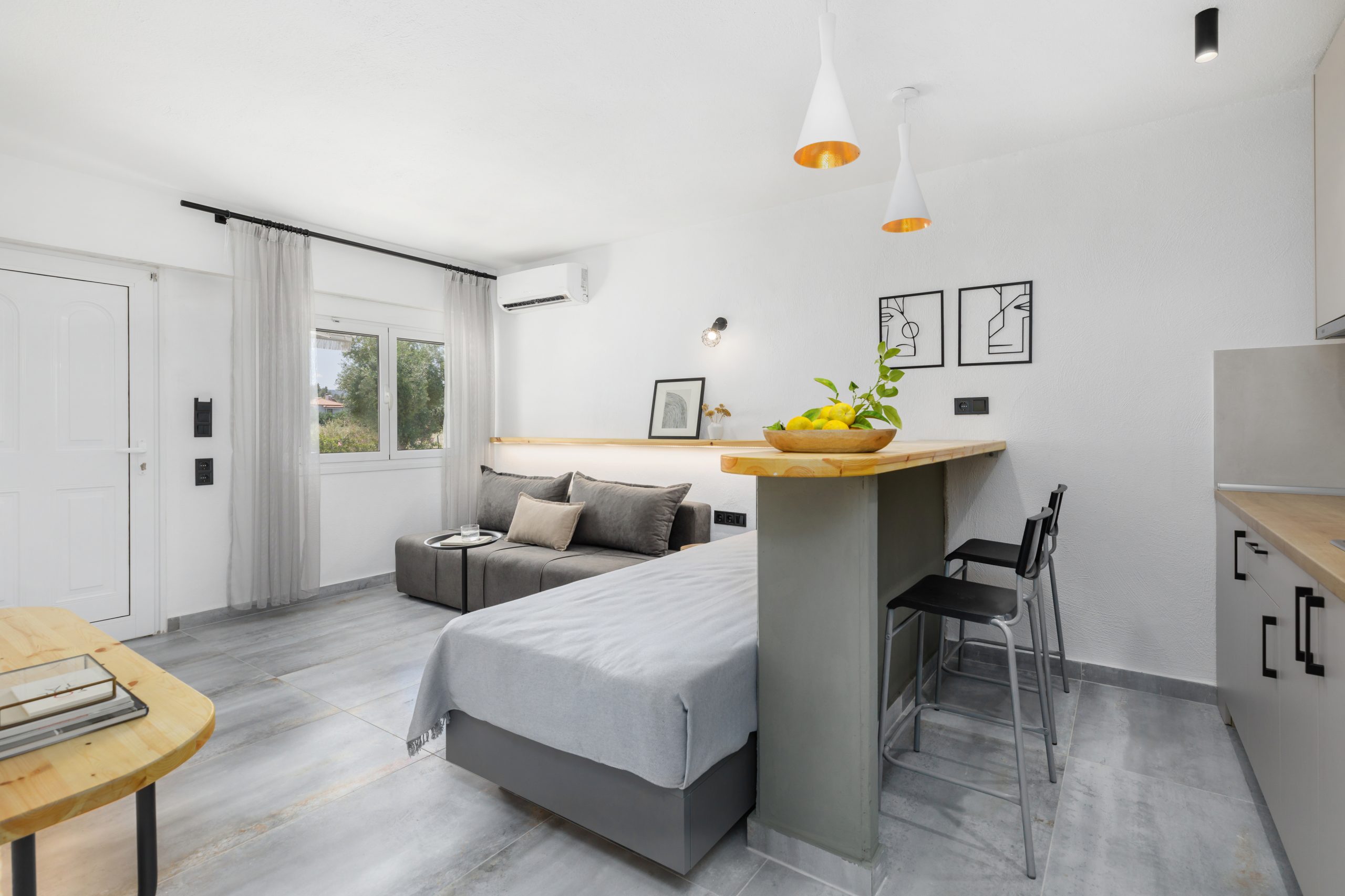 The rooms are newly renovated and feature a modern, minimalist design that combines traditional Greek island architecture with the simplicity and elegance of contemporary interiors. Each room is air-conditioned and equipped with a TV, bathroom, kitchenette with the basic equipment and comfortable balconies with dining tables.